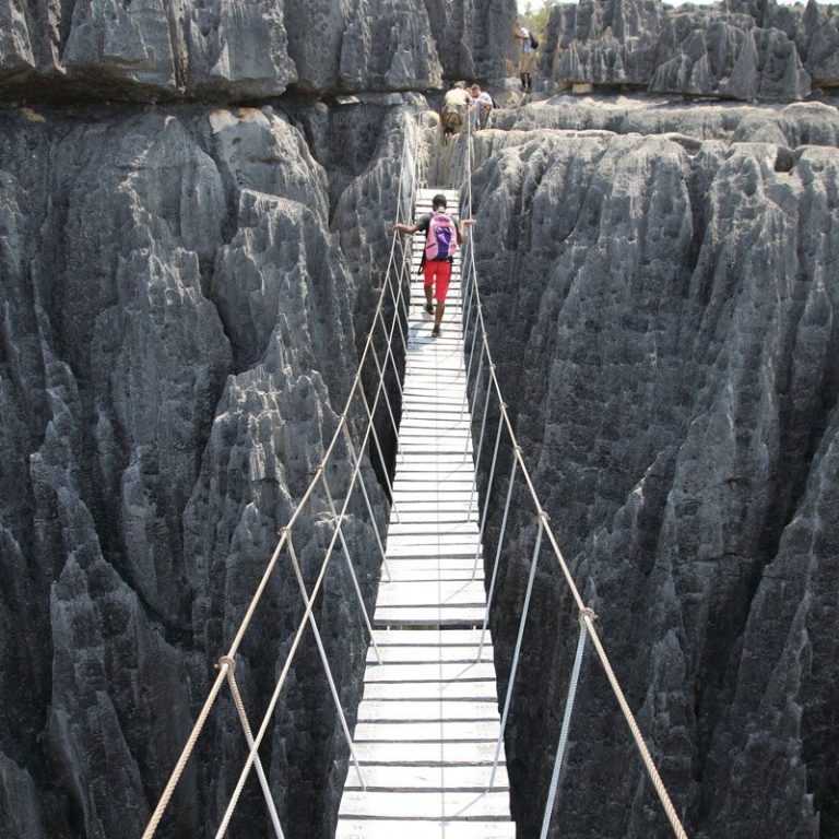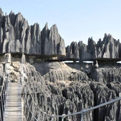 - Des paysages à couper le souffle s'offrent à vous : vous découvrirez un immense champ de Tsingy, avec ses cathédrales de calcaire gigantesques et ses lames acérées. Depuis un belvédère, vous profiterez d'une vue panoramique à 360° avant de traverser un pont suspendu de 70 mètres, de vous faufiler à travers des arcades naturelles et de descendre jusqu'au fond d'un canyon.